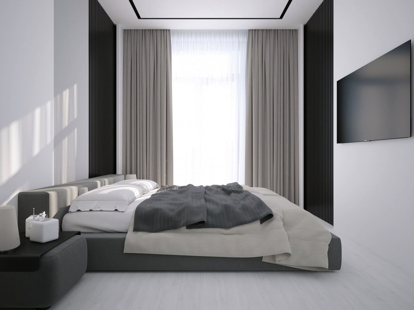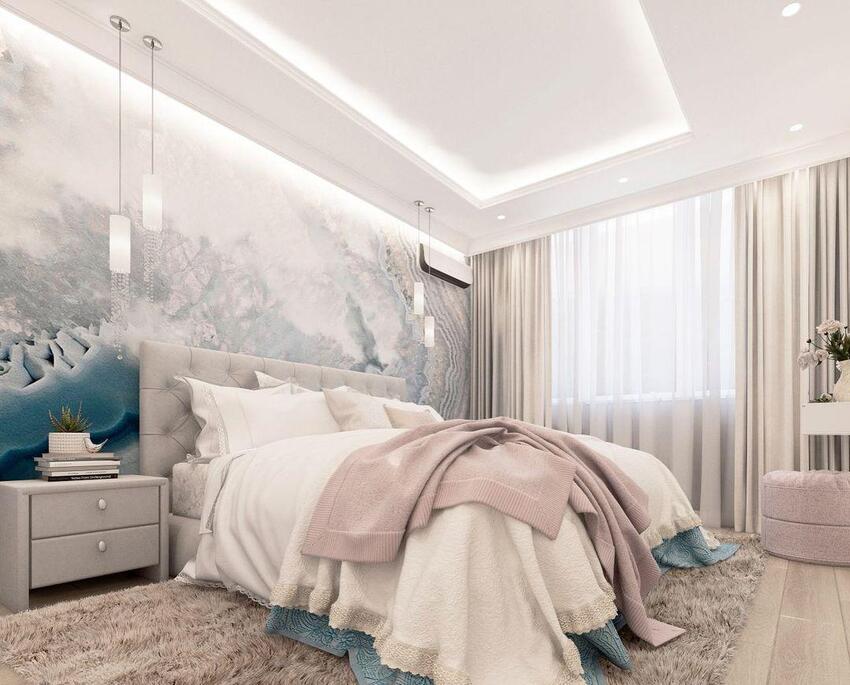 Высокие потолки позволяют сделать на них акцент, а многоуровневые или натяжные варианты в значительной мере разнообразят дизайн спальни 12 метров.