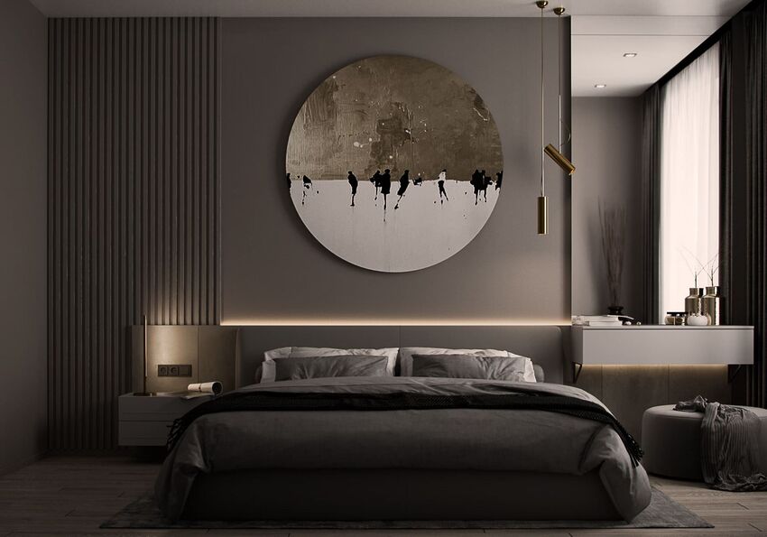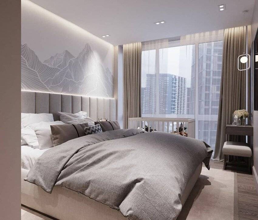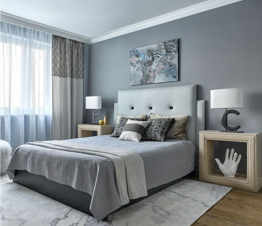 В отделке спальни в современном стиле используются натуральные и одновременно с этим сложные цвета: белый замещается молочным, желтый — горчичным и пр.