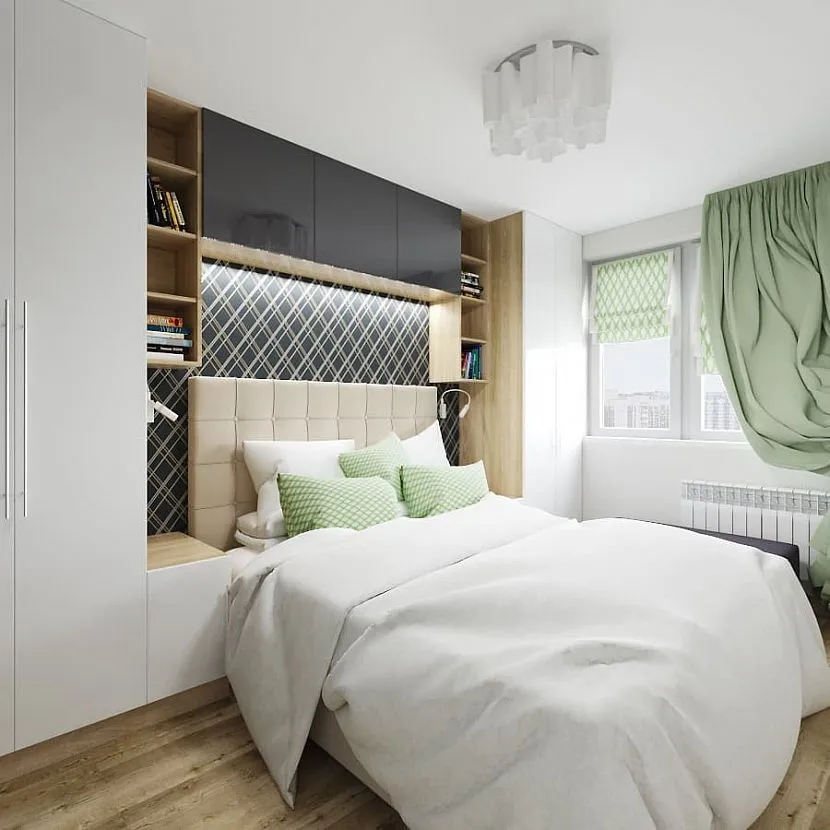 Для крошечной спальни рекомендуется приобретать компактную и функциональную мебель. Особенность комнат в «хрущевках» заключается в конфигурации помещений – обычно в плане это вытянутый прямоугольник. При оформлении такой спальни дизайнеры рекомендуют следующее: