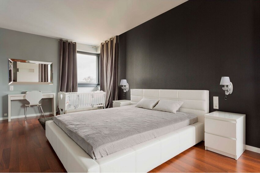 Только мелкие детали могут позволить не привлекать внимание людей к размеру комнаты. Аккуратные современные прикроватные тумбочки не испортят интерьер