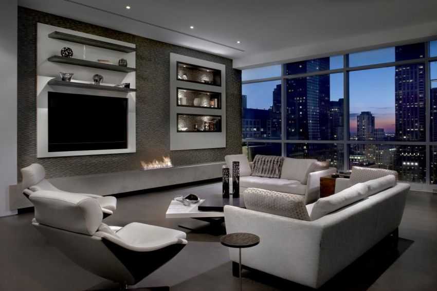 Для такого интерьера гостиной, одинаково хорошо подойдут модели, как в монохромных, так и контрастных оттенках. Украсить стенку и придать ей завершающих штрихов, поможет определенное наполнение.