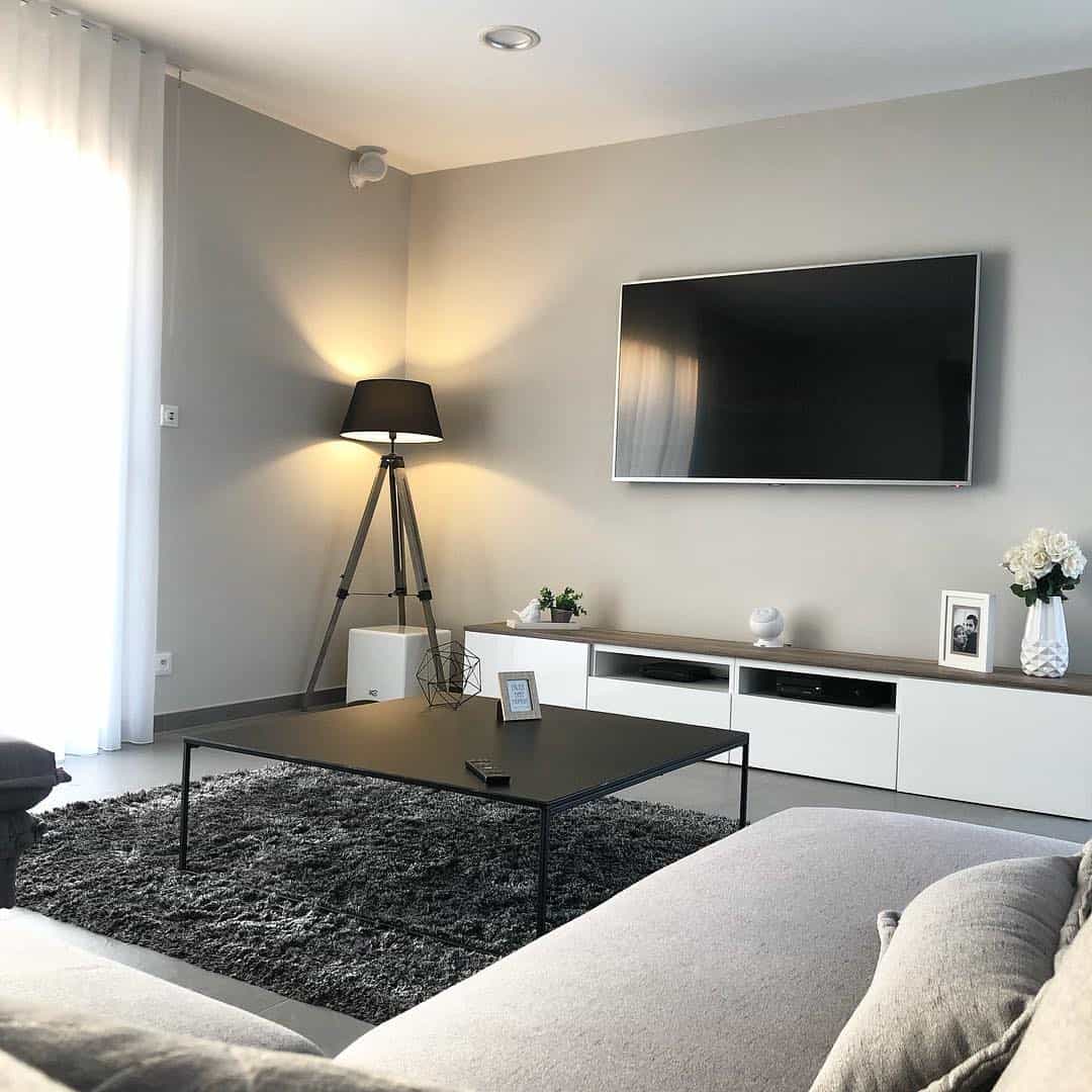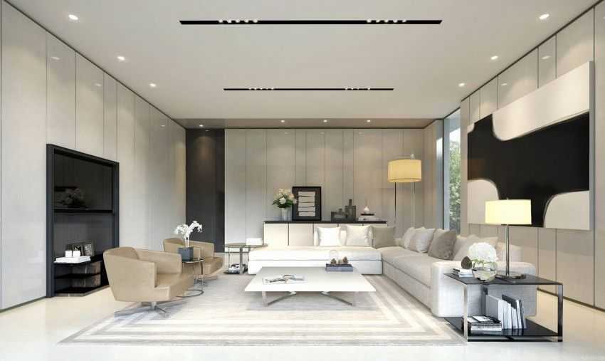 Минималистичный дизайн гостиной, предполагает использование более вместительных модулей в серых, бежевых или белых тонах. Фасады могут иметь матовое исполнение или быть декорированы стеклом, придающим конструкции больше легкости.