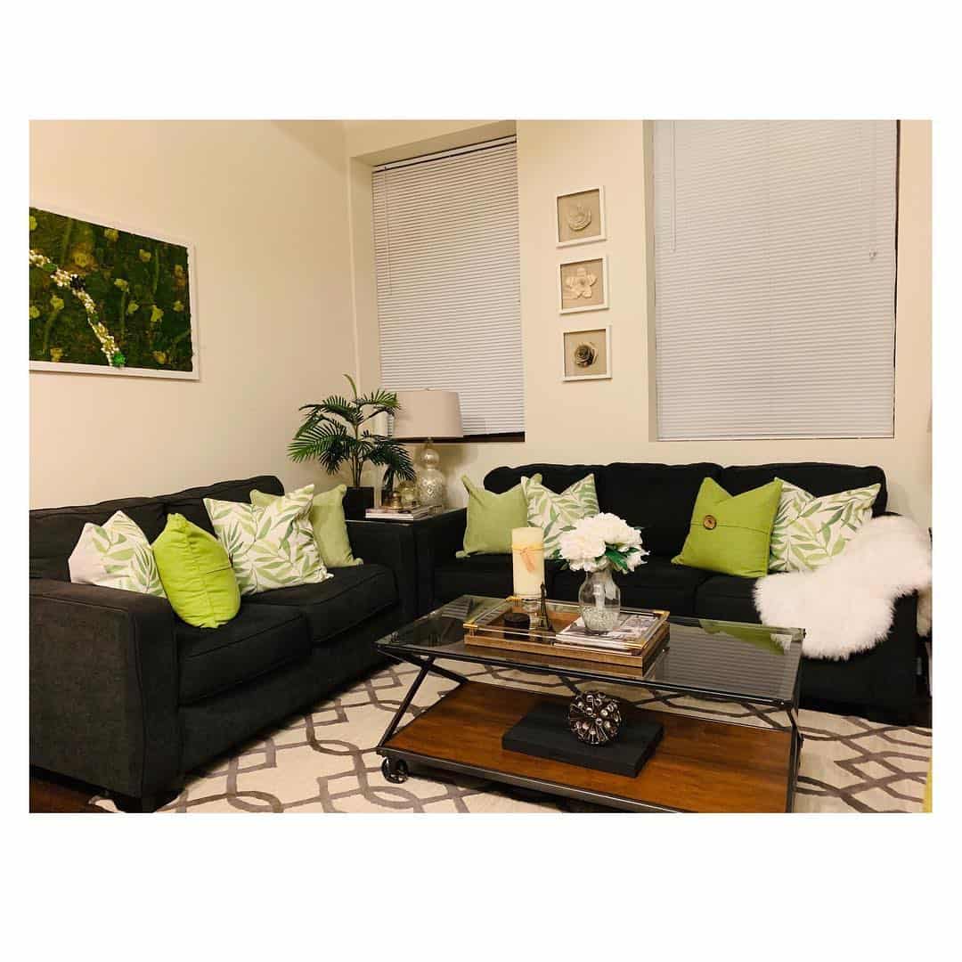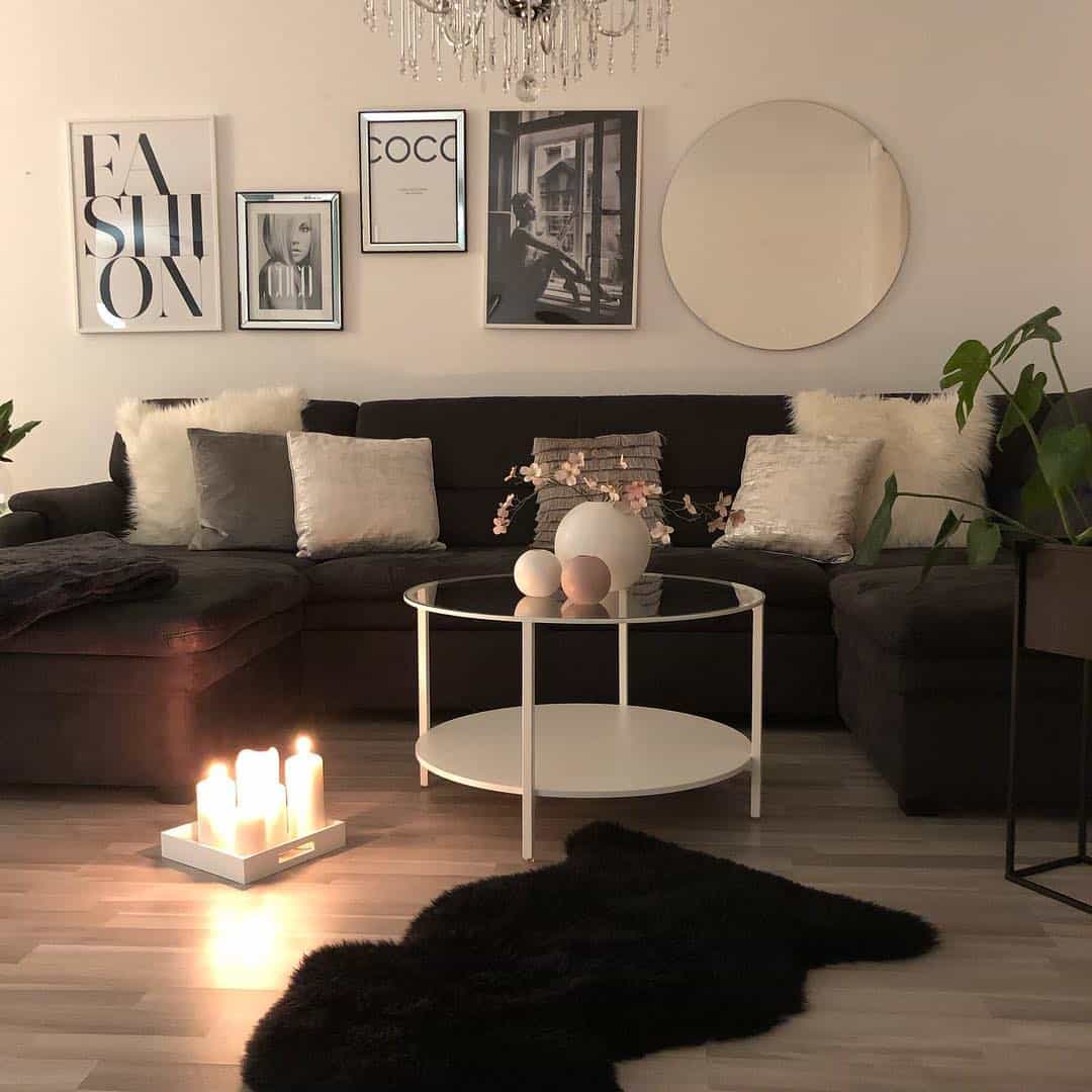 Рядом с диваном рекомендуется поставить журнальный столик. Лучше всего выбирать модели со стеклянной столешницей. Это поможет придать ощущение воздушности и изящности помещения.
