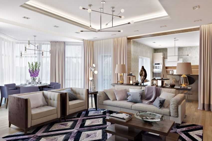 В интерьере гостиной 2020 года очень важно зонирование. В ней можно выделять зону для отдыха, маленькую столовую, кабинет и место для развлечений