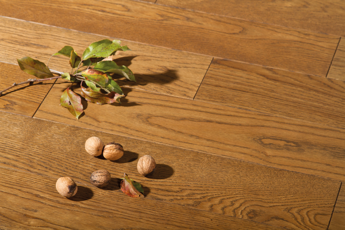 Дуб применяют в элитных покрытиях и он пользуется достаточным спросом у клиентов. Стандартная доска из него имеет два слоя, склеивание которых произведено перпендикулярно, что говорит о дополнительной прочности всего материала в целом. Этот же фактор заметно снижает риск механических повреждений, а также является залогом успешного противостояния влажности и перепадам температур.