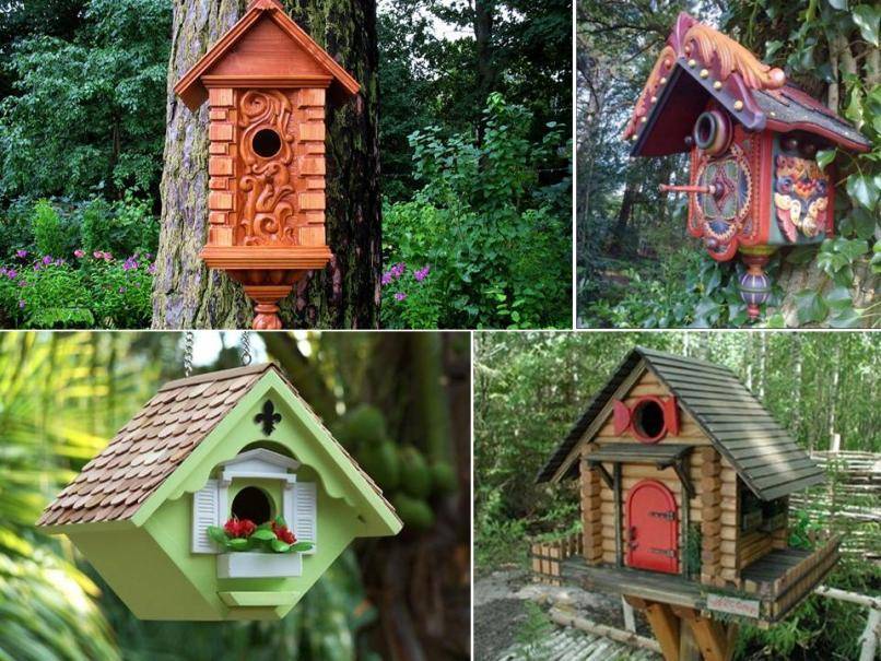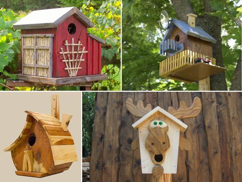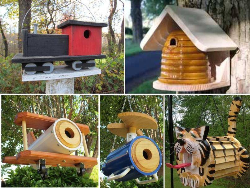 Еще несколько вариантов удачных и несложных решений. Палочки небольшого сечения позволяют дополнить поделку заборчиком, шпалерой и так далее. На двух нижних фото очень помогло использование лобзика. Применение древесины разного цвета и необычные формы птичьего домика обеспечили эксклюзивность работ.