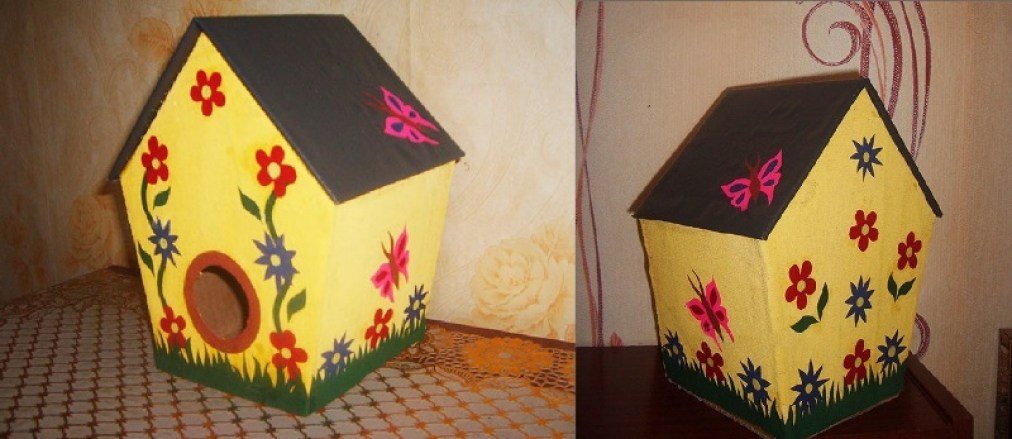 Если постараться, краски помогут превратить обычное птичье жилье в сказочный домик. Собственно конструкция не является сложной. Фантазия и старание – главные инструменты представленного успеха.