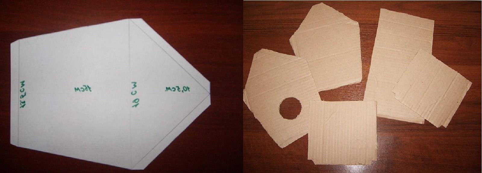 На простой бумаге делаем разметку будущей конструкции. Переносим схему на гофрокартон и вырезаем все детали в двойном экземпляре.