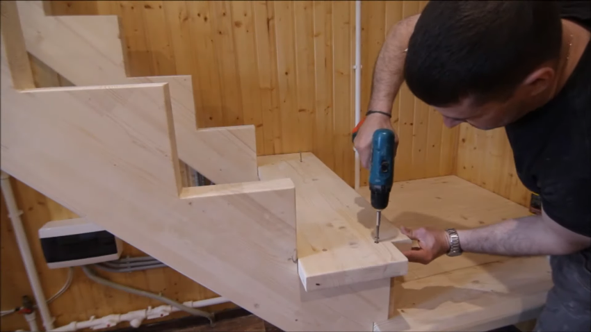 После монтажа подступеней устанавливаются ступени. Оба элемента крепятся с помощью саморезов с максимально глубоким утапливанием шляпки.