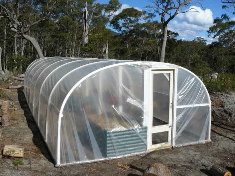 - Полиэтиленовая пленка прикрепляется к каркасу скобами или рейками из дерева. Плёнкой обтягиваете лицевую и заднюю части каркаса. Загибаете вовнутрь там, где запланирована дверь. Далее собирается каркас из трубок. Полученная рама для двери обтягивается плёнкой и крепится с помощью петель. Форточки изготавливаются по той же схеме.