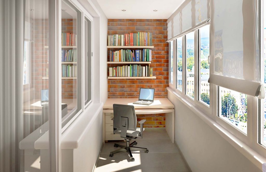Не меньшей популярностью пользуются рабочие кабинеты на лоджии в квартире, где балкон совмещен с залом, кухней или гостиной. Если помещение застеклено и есть подоконник, то функционального места будет меньше. Поэтому нужно выбирать небольшую модель стола, компактное кресло и многоярусный настольный стеллаж. В результате все детали для работы поместятся в одном углу. Если помещение узкое, а зона возле стола получилась слишком темной, придется подумать об установке дополнительного настольного светильника или настенного бра с рассеивающими лучами света.