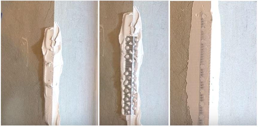 Для этого, как уже говорилось, используется углоформирующая лента или уголок. Лента оптимальная для внутренних углов, уголки – на наружных. Порядок работ тот же: наносится базовый слой шпаклевки, лента или уголок вдавливаются в нее.