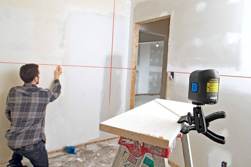 - С помощью прожектора, проверятся плоскость стены, потолка или откоса.