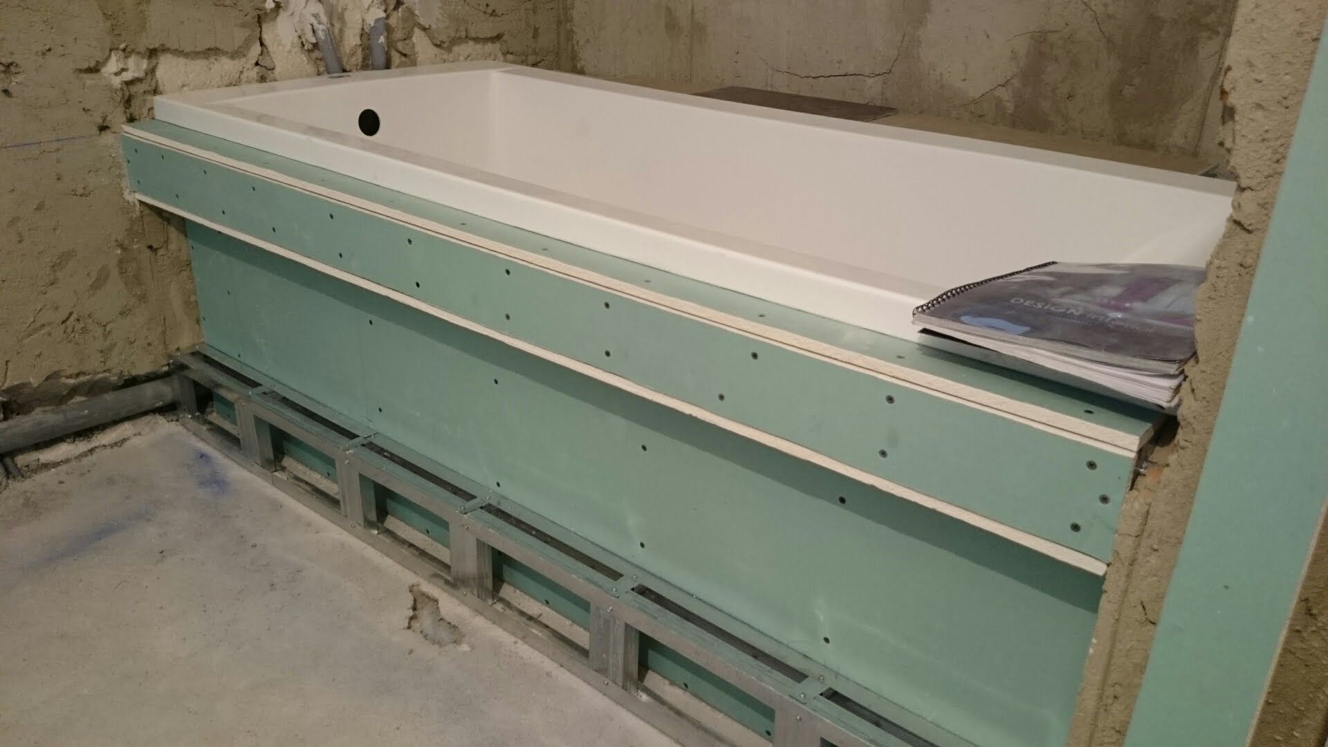 Экран под ванной также можно сделать из гипсокартона и облицевать плиткой