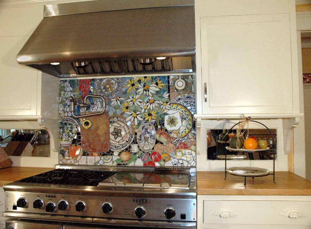 Идей для такого украшения даже не море, настоящий океан. От абстрактных композиций, выложенных прямо на стенах, до отдельных табличек с фотографиями и рецептами. Украшенная таким образом кухня своими руками становится не только ярче, но и уютней.