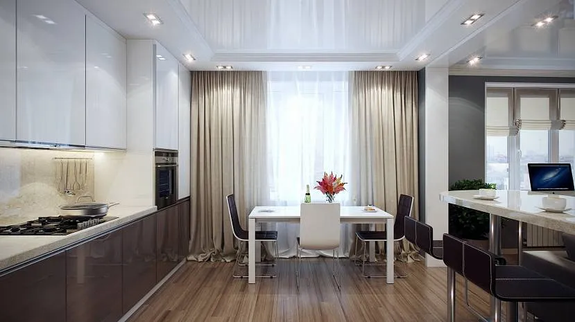 Кухни в стиле модерн подойдут классические шторы в пол Источник jkuhnya.ru