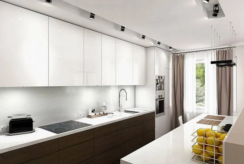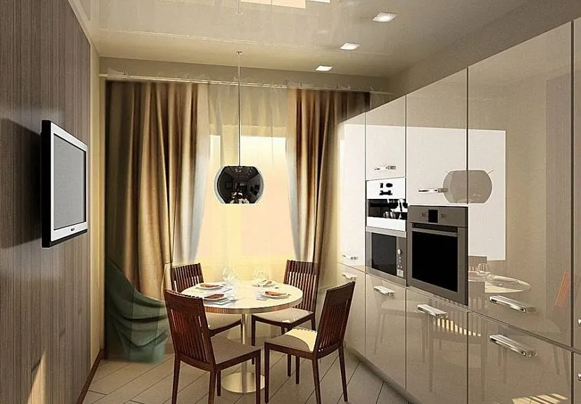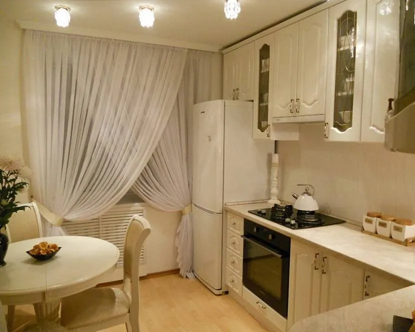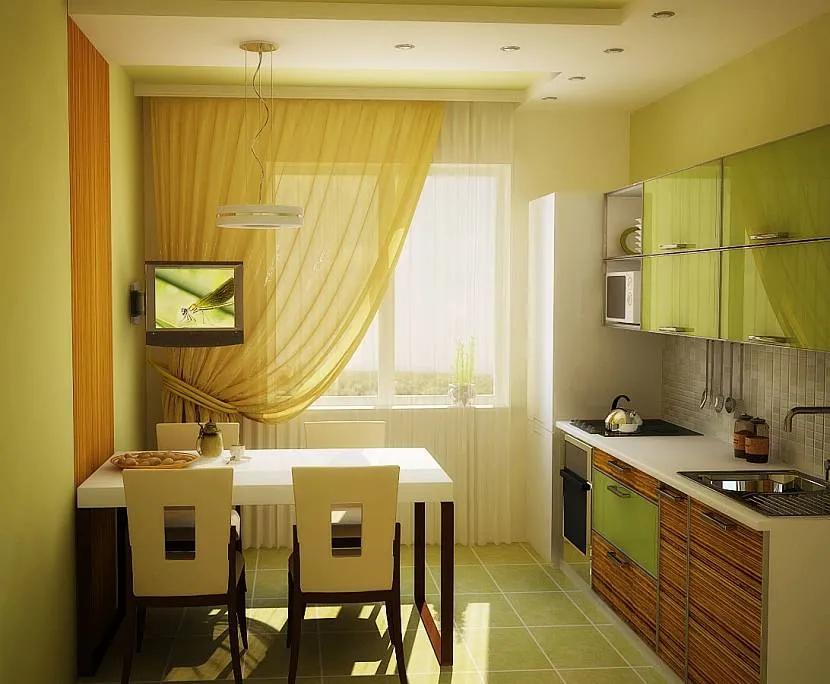 - если кухня длинная и узкая, можно повесить темные шторы, этот прием зрительно приблизит дальнюю стену;