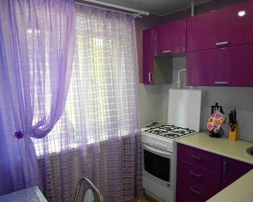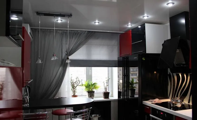 Для современного интерьера кухни подойдут шторы, исполненные из ткани с глянцевой поверхностью Источник idealkuhnya.ru