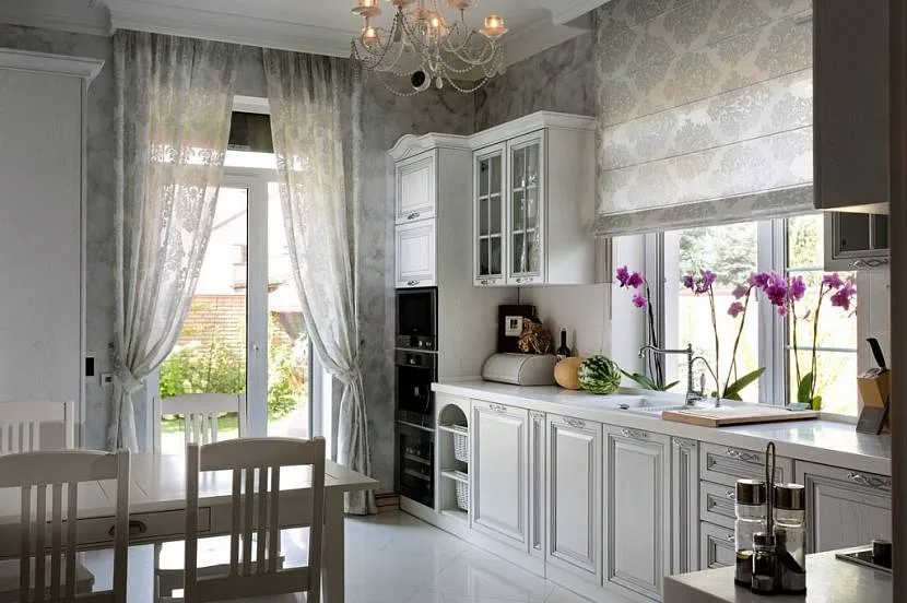 Классический стиль ‒ наличие бахромы, тесьмы, кисточек. В узорах должна читаться строгая симметрия, вертикальные, горизонтальные полоски, вензеля. Хорошо выглядят однотонные варианты. Если помещение позволяет, лучше использовать длинные шторы из натуральных, плотных тканей. Красиво в просторной кухне будут смотреться варианты с подхватами и ламбрекеном.
