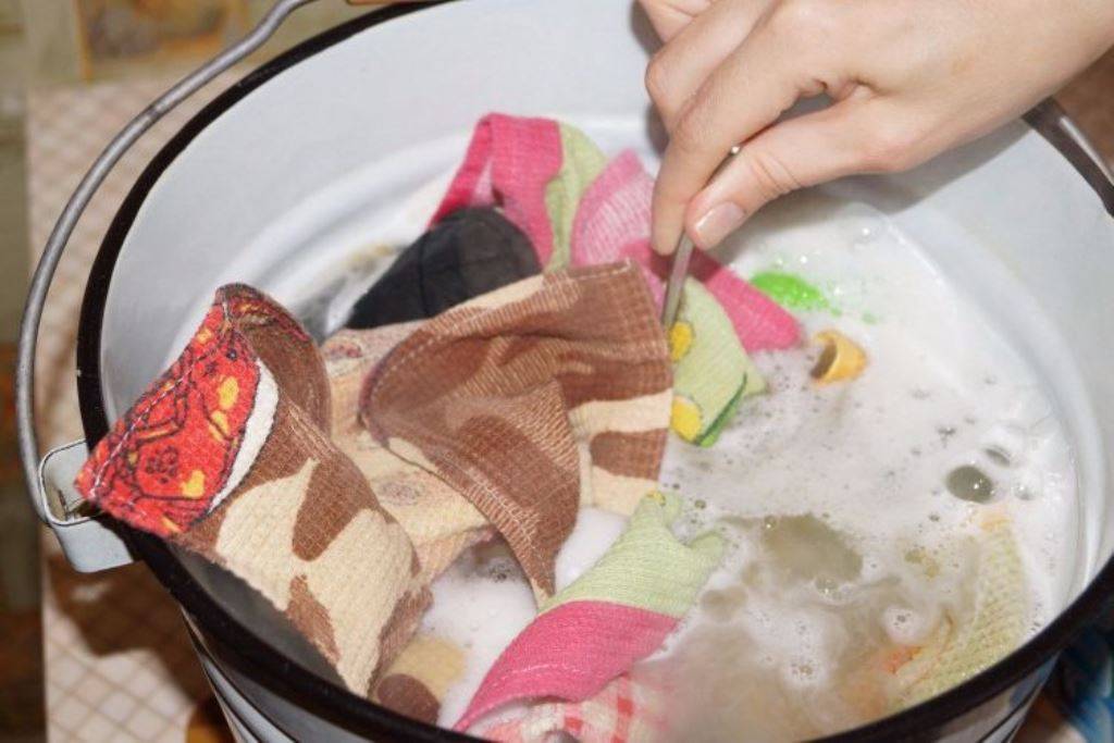 В 6 л воды растворите 2 ст. л. отбеливателя, застелите дно эмалированной высокой кастрюли или ведра ненужным куском ткани. Перелейте раствор в емкость для кипячения, загрузите полотенца. Доведите жидкость до кипения, после чего томите на огне в течение 60 минут, периодически помешивая палкой из дерева. После завершения процесса дождитесь полного остывания воды, переложите кухонные полотенца в таз, а потом прополощите под проточной водой 2-3 раза.