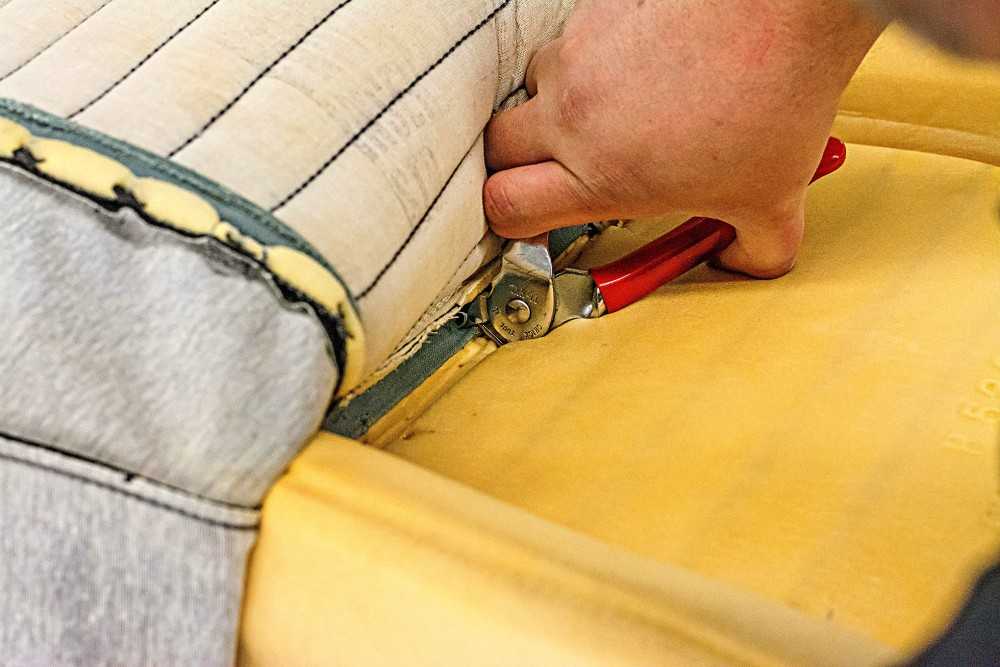 Скобы для крепления старой ткани вынимают ножом или отверткой и бережно снимают обивочную ткань