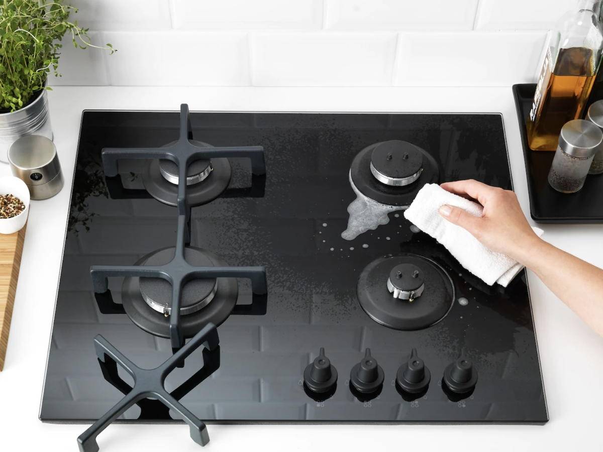 Хозяек волнует, как быстро и просто привести в порядок кухонную помощницу. Если потёки или брызги пищи не успели обгореть и надёжно закрепиться на варочной панели, то уборка эффективна при помощи мокрой тряпочки с моющим средством для посуды или без такового. Быстро отмыть газовый прибор с поверхностью из нержавеющей стали поможет сода. На влажную поверхность следует рассыпать примерно 2 столовые ложки гидрокарбоната натрия и равномерно распылить сверху воду. Такой очистке подлежат электроплиты, которые имеют сплошную поверхность.