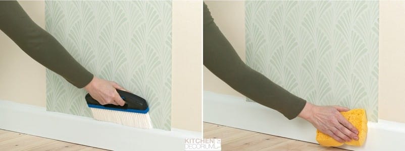 Пропитавшийся лист наклеивают на стену. Шпателем удаляются пузырьки и лишний клей. Попавший на полотно клейстер удаляют чистой тряпкой. Валиком полотно прижимается к стене.