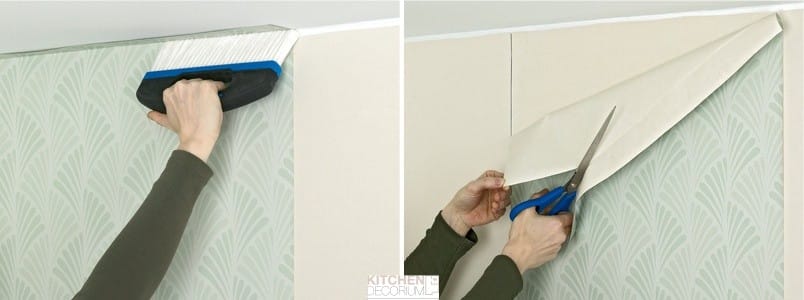 - Лишняя часть накладывается внахлёст на кромку обоев, плотно прижимается шпателем. Излишки обрезаются.