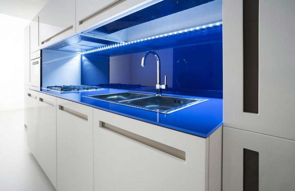 Подсветку можно обустроить внутри самой рабочей фурнитуры, а не у мебели. Можно выбрать стеклянные варианты фартука, который легко оборудуется светодиодными лентами.