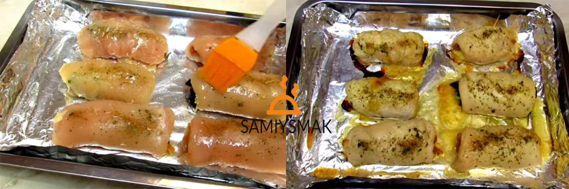 - Мясо солим, перчим и выкладываем половину соуса, распределяем по поверхности грудки.
