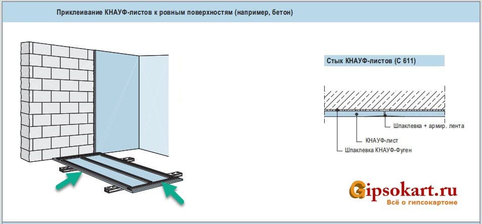Примечание: Листы ГК клеятся вертикально, встык. Торцевая стыковка листов нежелательная.