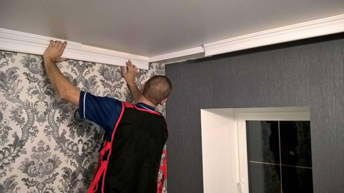 Легкий пенопластовый молдинг разрешено приклеивать к уже отделанному основанию. Часто его клеят на окрашенный потолок и стены с отделкой из обоев. Для приклеивания применяют клеевые смеси на полимерной основе.