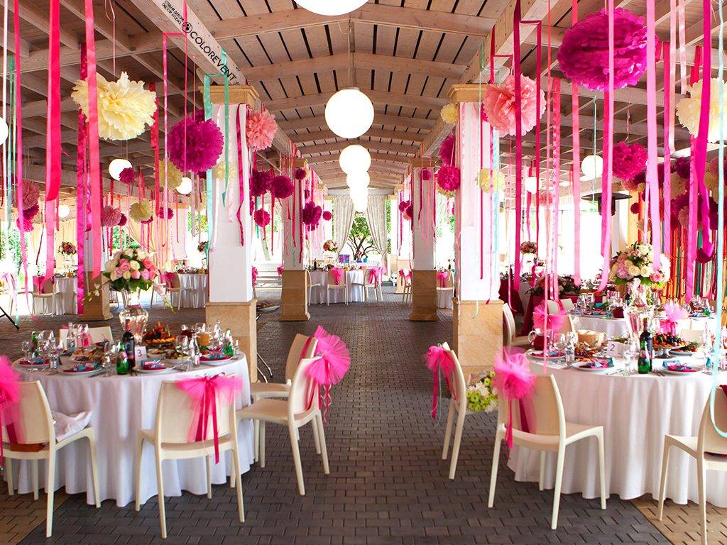Иногда в роли главной темы выбирают один цвет. На фото ниже представлена свадьба в розовом цвете. Незамысловатый декор делает зал не просто праздничным, но поистине красивым: