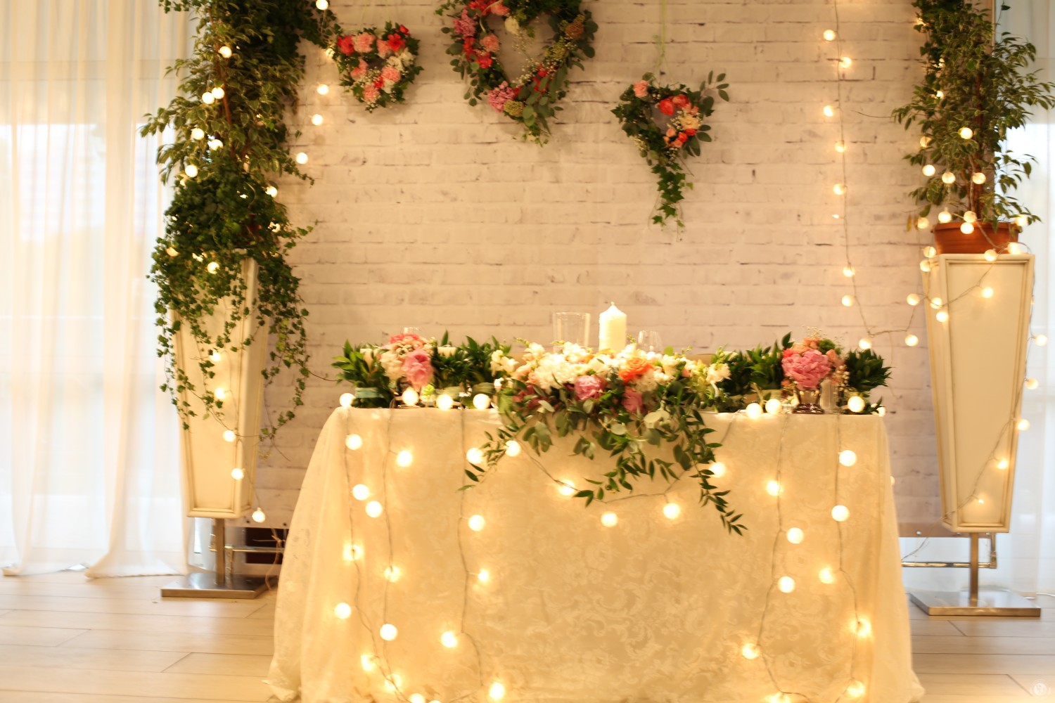 - Гирлянды-водопады добавят нотки таинственности и шика. Их можно разместить на части скатерти, обращенной к гостям, или на заднем плане (шторах, ширмах).