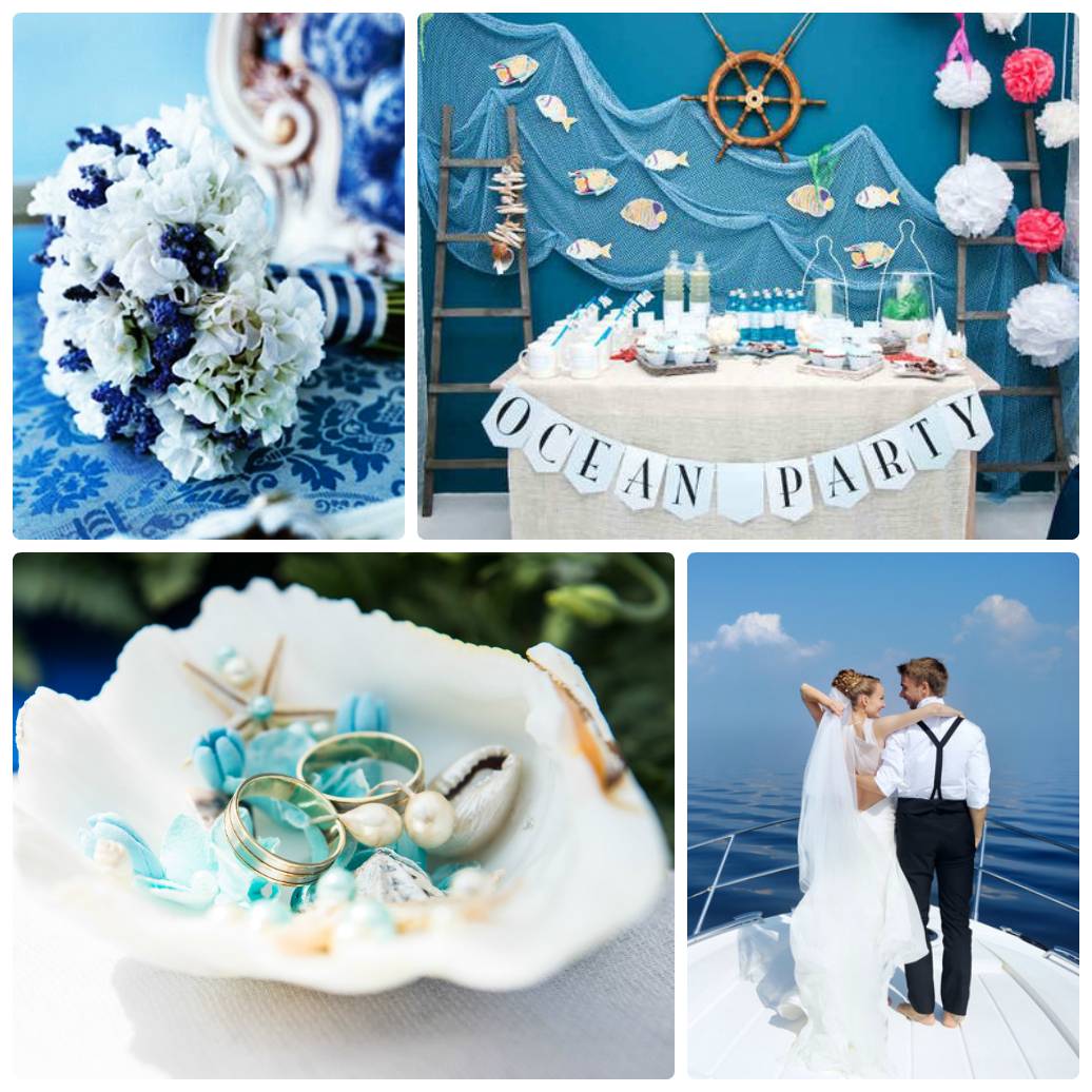 - Морская волна. Украшение на свадебный стол может быть выполнено в морской тематике, которая не теряет своей актуальности уже который год подряд. Используйте модные цвета этого года – тиффани и «ниагара», чтобы сделать декор более модным. В морском декоре используйте полоску, раковины и морские звездочки. На столах можно расставить маленькие миниатюры известных кораблей, а через стол пустить настоящие канаты.