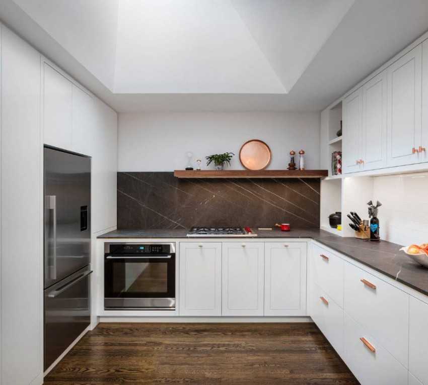 При П-образной или Г-образной планировке нужно спроектировать угловой шкаф. Если блоки конструкции соединяются между собой под прямым углом 90 градусов, нужно вдумчиво планировать выдвижные ящики и открывающиеся дверцы. В таком случае делают специальные вставки. Это позволяет дверцам и выкатным ящикам не пересекаться между собой.