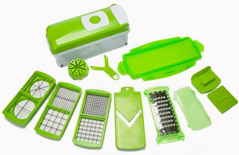 В завершение рейтинга представляем овощерезку со сменными насадками в большом количестве. Она продается только в зеленом цвете, но выглядит вполне современно и привлекательно. Данное изделие разрешается мыть в посудомоечной машине, но с насадками рекомендуется быть осторожнее, поскольку некоторые из них заточены чересчур сильно. Купить овощерезку удастся примерно за 900 руб.