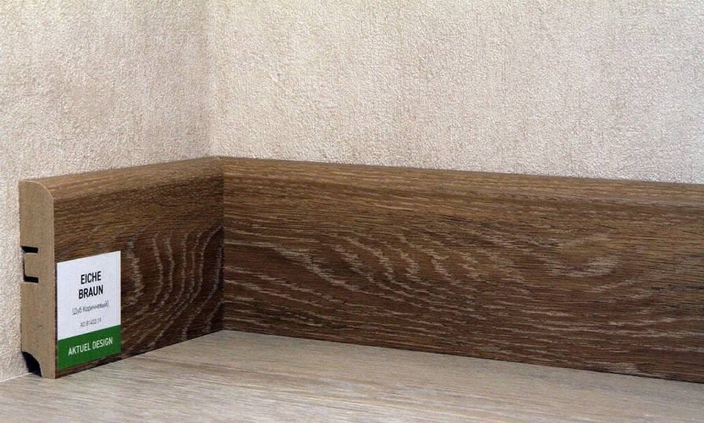 - Изделия из МДФ или ХДФ – данные синтетические материалы различаются между собой лишь плотностью. Изготовление происходит следующим образом: из расплавленной массы создается планка, на которую наносят ламинирующий слой ПВХ или шпона. Данные отделочные элементы следует устанавливать, если пол покрыт линолеумом или уложен ламинат «под дерево». Цвет плинтуса должен подходить под тон покрытия. Эти же изделия можно приспособить для обналички дверных проемов из-за легкости их монтажа.
