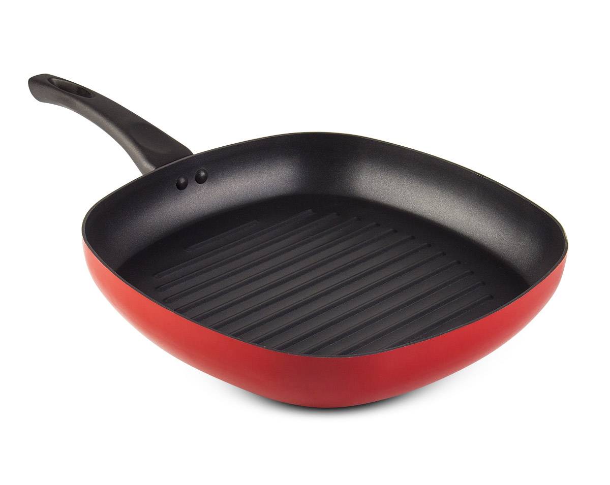 - Гриль – легко узнаваемые изделия благодаря наличию ребристого донышка, которое образует на еде привлекательные зажаренные полоски. Имеет круглую или квадратную форму, а также оснащается двумя ручками – продолговатой и закругленной. Гриль хорош тем, что позволяет жарить без масла, пища готовится быстро и не пересыхает внутри.