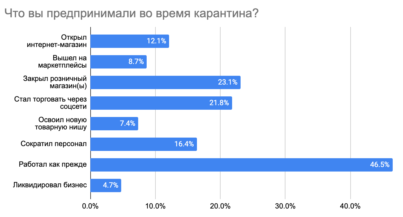 Кроме того, во время карантина многие предприниматели попробовали новые каналы продаж. Так, 22% начали торговать через социальные сети, 9% вышли на маркетплейсы, 7% открыли новую товарную нишу.