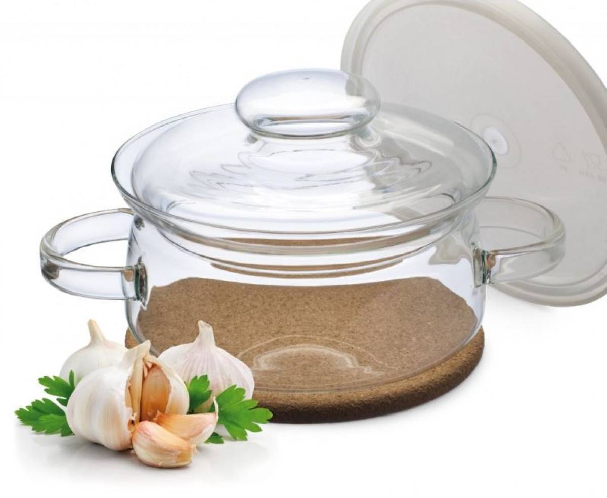 Посуда для стеклокерамической варочной панели из стекла также справляется со своим основным предназначением. В то же самое время, у этого материала достаточно невысокие показатели теплопроводности, а значит и времени на приготовление пищи придется потратить больше, особенно по сравнению с другими материалами.