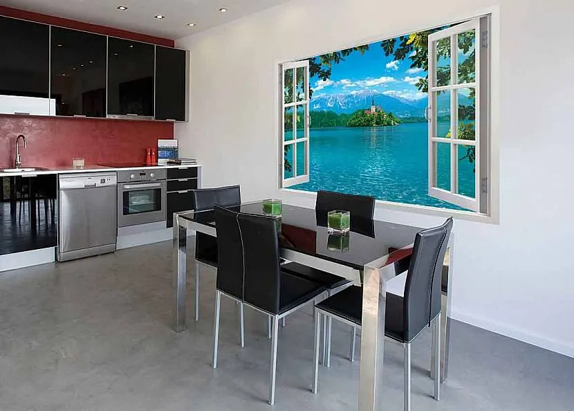 Альтернативой вышеописанных пейзажей выступают обои-обманки. Наиболее популярны в этом случае изображения окна или балкона с великолепным видом за ним. Это может быть море или городская улица. При этом часто достигается эффект пространственного портала. И, не выходя из своей кухни, зрительно можно перенестись в любое место на планете.