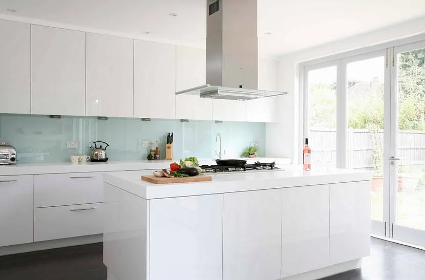Для более лаконичного и строгого дизайна белой кухни подойдёт скинали: однотонный графитовый фартук из прочного стекла сделает белую кухню более контрастной. Его единственный недостаток – глянцевая поверхность, на которой хорошо видны любые загрязнения.