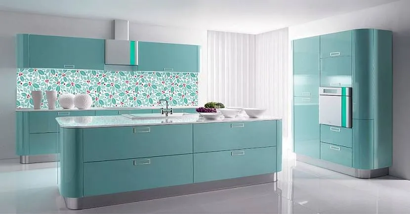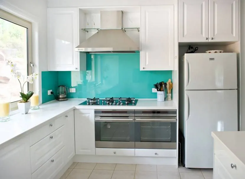 Бирюзовый фартук на белой кухне Источник td-universe.com