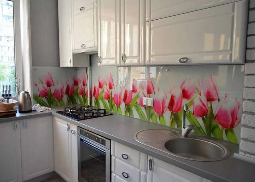 Фартук с изображением ярких тюльпанов отлично гармонирует с нежной кухней бежевого оттенка.
