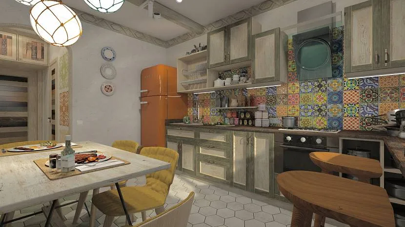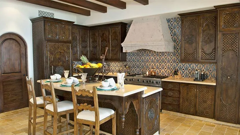 В декоре принято использовать шторы из натуральных материалов (лен или хлопок с орнаментом), всевозможные коврики и дорожки (тканые или лоскутные), посуду ручной работы из дерева или глины.