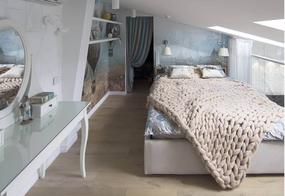 Дизайнер Татьяна Крыгина для своей заказчицы — молодого врача — создала проект, в котором антресоли превратились в мансардный этаж, выделенный под спальню. Там разместилась двуспальная кровать нюдовых оттенков.