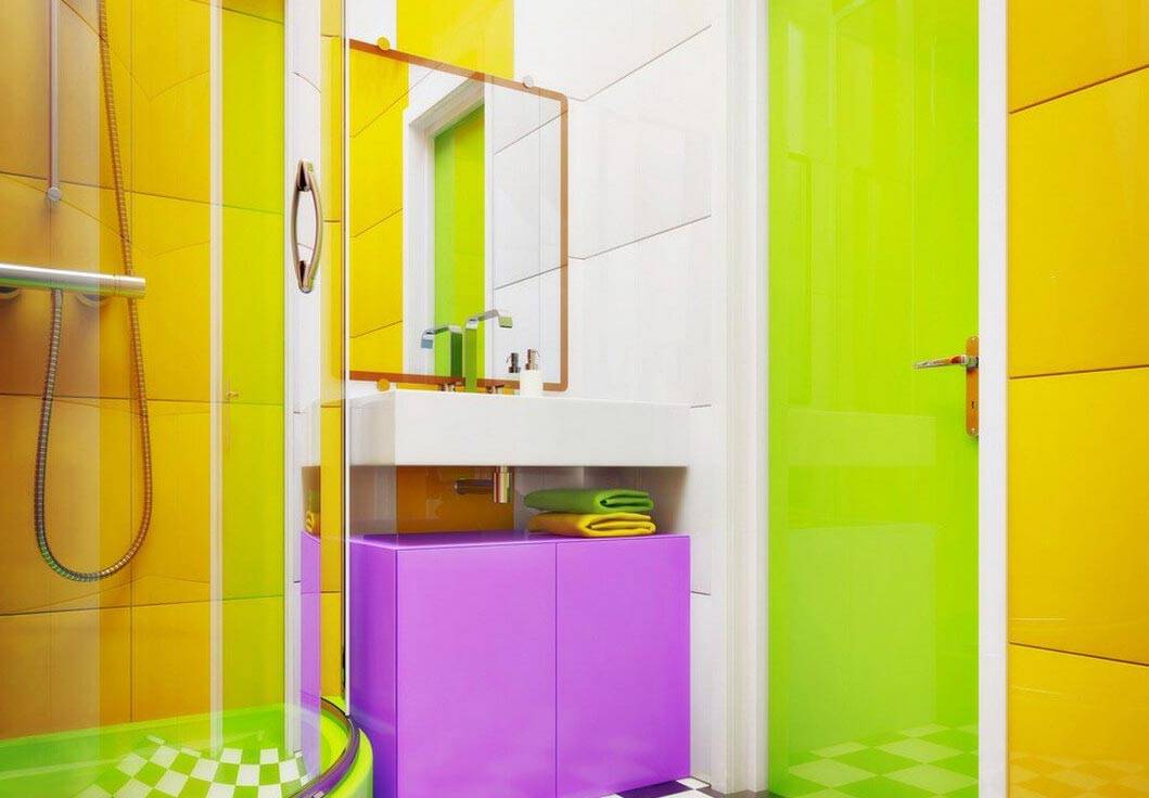 При использовании насыщенных оттенков в компактной ванной необходимо в качестве фона выбирать нейтральные цвета. Выигрышный вариант оформления одной стены ярким цветом (оранжевый, фиолетовый, зеленый). Оригинальны стены, отделанные красными плитами с добавлением оливковых и белых блоков.