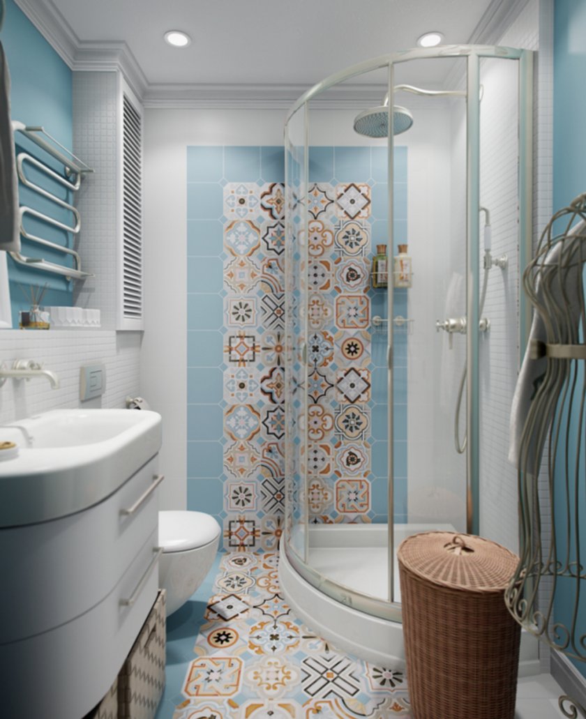 - однотонная цветная плитка – отлично подходит для обустройства разноцветной мозаики в душевой кабинке, если плитка мелкая.