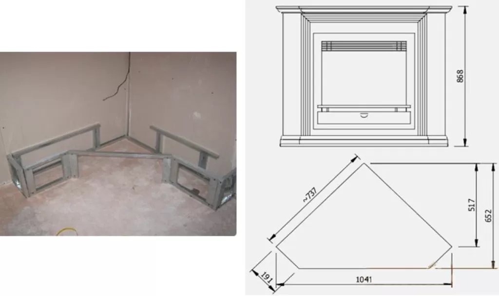 - Подобным образом из гипсокартона и металлического профиля собираем подножие будущего портала камина и каминную полку.